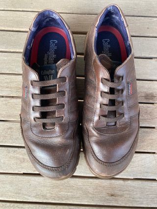 Zapatos de piel marrón de hombre talla CallagHan talla 41. Tienen algunos roces en la piel de la zona delantera, especialmente el derecho, pero pueden disimularse con hidratación y manteca de caballo. Son cómodos para caminar y elegantes.