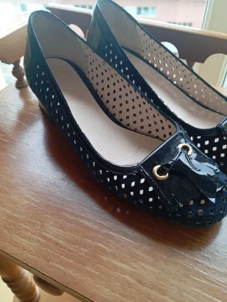 Zapatos planos Ted Baker – nuevos con caja original Charol negro, punta fina y banda elástica dorada cruzada que aporta sujeción y sofisticación. Interior con estampado floral de colección y tacón de 1 cm. ✨ Nuevos, con leve desgaste en la media suela por pruebas en tienda. 🔍 Iniciales TB grabadas en la puntera: detalle exclusivo. 🎀 Caja original + tarjetas de cuidado impecables. 🛍️ Comprados en Londres en department store de lujo. 🎁 Diseño especial, presentación impecable… ¡listos para estrenar o regalar!” Cualquier duda, envía mensaje Descuento por LOTE