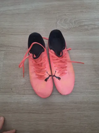 Zapatos de fútbol Puma con un diseño llamativo. - Color principal rosa con detalles negros. - Cierre con cordones.