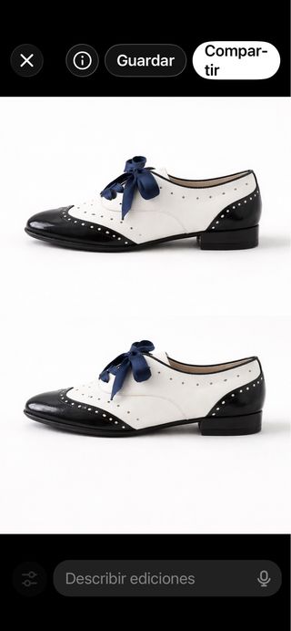 Elegantes zapatos Oxford de piel con un diseño bicolor. - Combinación de blanco y negro. - Detalle de lazo azul marino. - Puntera y talón en charol negro. - Adornos perforados.