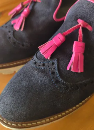 Zapatos de piel vegana de la marca Fluchos en color azul con detalles en marrón. - Diseño de cordones. - Suela de goma. - Muy cómodos - Muy poco uso. Impecables