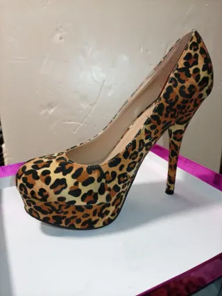 Elegantes zapatos de tacón con un llamativo estampado, solo se ha usado 1 vez. - Diseño de leopardo. - Tacón alto y plataforma. - Acabado en ante.