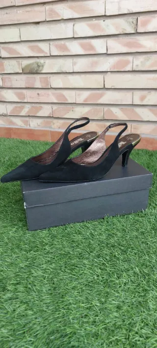 Elegantes zapatos de tacón de ante. - Diseño de punta fina. - Tira en el talón. - Detalle metálico en el tacón.