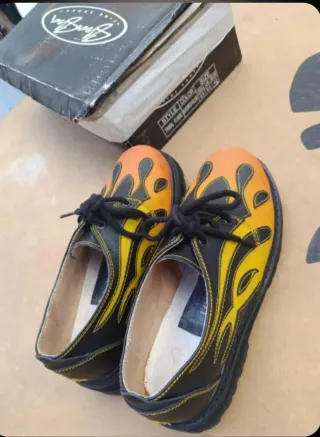 Zapatos Underground con un diseño muy llamativo. Son bastante pesados. Poco uso, prácticamente nuevos. - Estilo con llamas en negro y naranja. - Cordones negros. - Suela negra con tornillos que ribetean la suela por la parte inferior. ** Cinturón en condiciones aceptables**