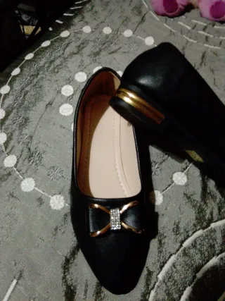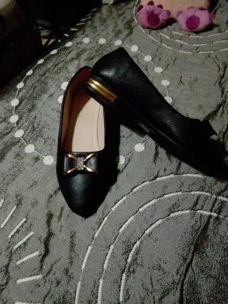 Elegantes zapatos planos sin estrenar, perfectos para cualquier ocasión. - Diseño con lazo y pedrería en la punta. - Detalle metálico dorado en el talón.