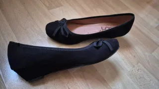 Elegantes zapatos negros tipo bailarina / manoletina, con detalle de lazo. - Con 3 centimetros de cuña aprox. - Material exterior de ante. - Número 37 - Usados en un sólo día.