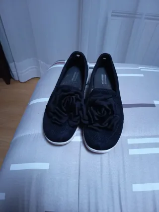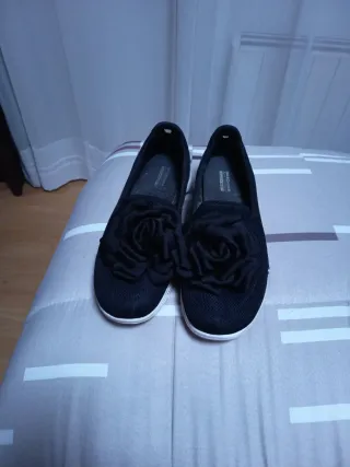 Zapatos planos Skechers para mujer en color negro. Presentan un diseño floral en la parte delantera.talla 40 de 27 cm - Cierre sin cordones. - Suela blanca. - Detalle de flor. - Tejido de malla.
