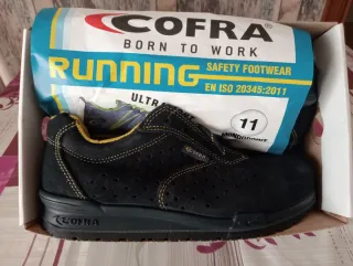 Zapatos de seguridad COFRA sin estrenar, de color azul, ideales para el trabajo. -Talla 39. - Diseño con perforaciones. - Detalle de costuras amarillas. - Logo de COFRA en la suela y etiqueta.