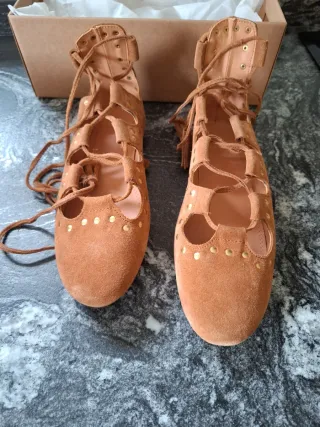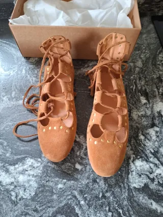 Elegantes zapatos planos estilo boho con cordones. - Diseño con cordones que llegan hasta el tobillo. - Adornados con pequeños detalles dorados. - Material de ante en color marrón.