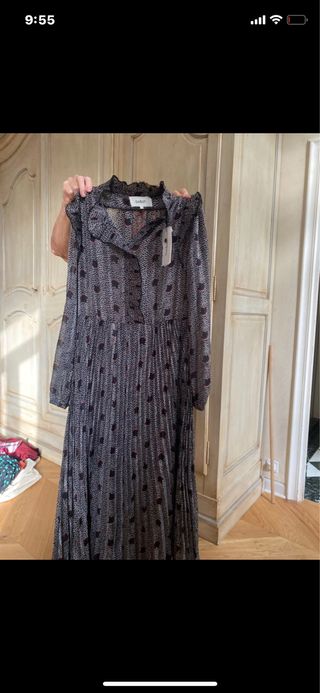 Vestido de la marca ba&sh con un estampado llamativo. - Diseño con cuello. - Manga larga. - Largo hasta la rodilla.