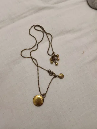 Elegante collar de estilo antiguo con un acabado dorado. - Cadena fina con eslabones. - Colgante circular. - Adornos adicionales en la cadena.