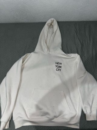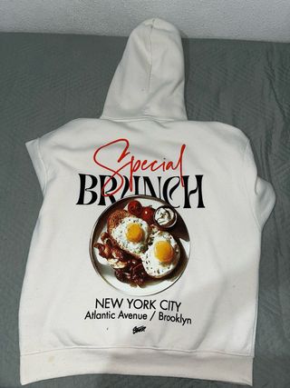 Sudadera con estampado Special Brunch de Pull and Bear. Con dos pequeños defectos, presenta una mancha en la parte trasera abajo y una pequeña rotura en el bolsillo - Diseño con estampado. - Estilo New York City. - Cuello con capucha.