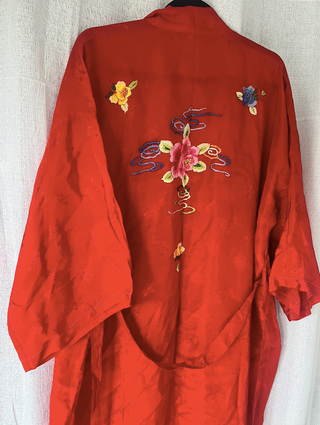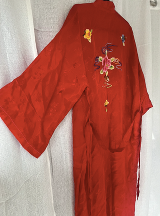 Kimono estilo oriental en color rojo con bordados florales multicolor en la espalda, con manga amplia estilo kimono. Tejido ligero con textura y brillo sutil. Corte amplio y cómodo (talla única / oversize). Puede usarse como kimono, bata o chaqueta ligera. ✨ Color: Rojo ✨ Talla: Talla unica (L-XL) ✨ Medidas: hombros 42cm / axilas 68cm / largo 122cm / largo manga 48cm / ancho manga 24cm ✨ La prenda tiene dos pequeñas manchas que pasan desapercibidas, se pueden ver en las imagenes