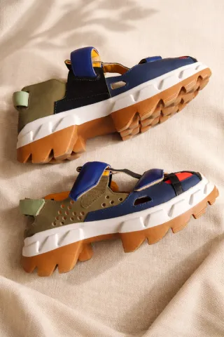 Sandalias de piel de la marca 4CCCCEES en talla 40. Combinan tonos azules y naranjas con un diseño moderno. - Cierre de velcro. - Suela gruesa y cómoda. - Detalle de tiras. - Utilizadas en dos bodas. - Están en su caja original.