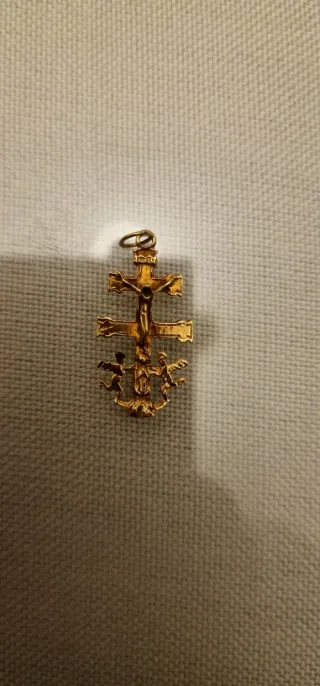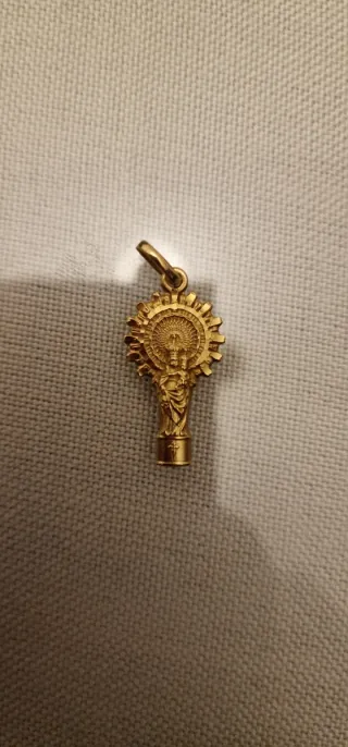 Precioso colgante de la Virgen del pilar,cadena muy bonita es la que mas pesa y cruz de carabaca Todo en muy buen estado la cruz de carabaca se a puesto un poco amarillenta pero me han dicho en una joyeria que es normal es de no usarla todo en 18 kt Asta mañana viernes si no lo llevaré al compro oro Peso entre 9,6 y 9,7 - Fabricado en oro de 18 quilates.