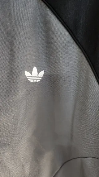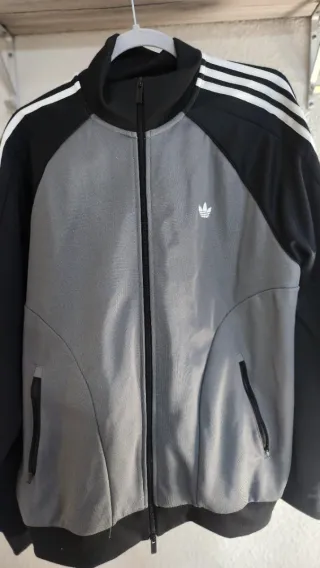Chándal completo de Adidas con un diseño moderno. - Mangas y hombros en color negro. - Cuerpo principal en color gris. - Tres rayas blancas en las mangas. - Logo de Adidas en el pecho. - Cremallera frontal. - Bolsillos laterales con cremallera.