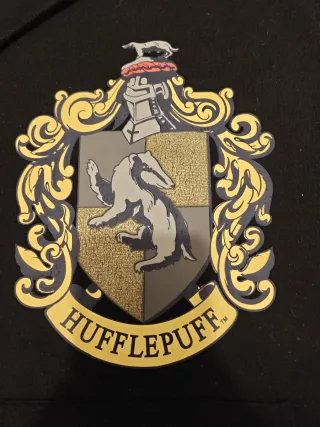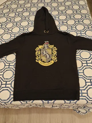 Sudadera negra con el escudo de Hufflepuff de Harry Potter. - Diseño del escudo de Hufflepuff. - Capucha con cordones. Mancha en una manga (ver ultimo foto)