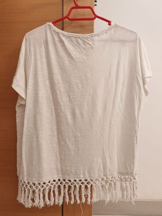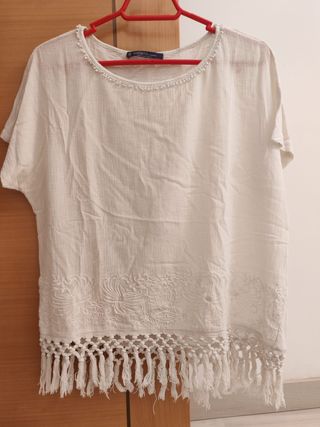 Camisa blanca de la marca Violeta by Mango, caracterizada por su diseño bordado y flecos en el borde inferior. Talla M. Muy bien cuidada, en buenas condiciones.
