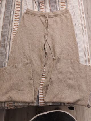 Pantalón de Kiabi en punto suave de mezcla de lana, con corte holgado, perneras rectas y cintura elástica con cordón. Color beige. Talla L. Usado dos veces, en perfectas condiciones. Tengo el jersey a juego tambien publicado a la venta.