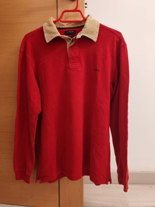 Polo de rugby de manga larga de color rojo con cuello de pana color beige. Marca Cortefiel, fabricada en 100% algodón. Talla M. En perfectas condiciones.