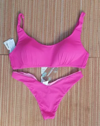 Bikini de la marca Calzedonia en color rosa. - Top talla 3 ( equivale a una 90) y braguita brasileña reversible 2 ( S). - Diseño moderno y cómodo.