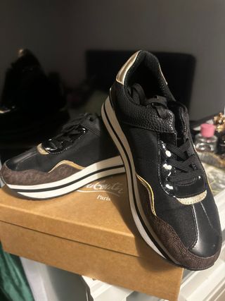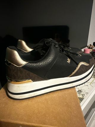 Zapatillas de la marca Michael Kors en tonos negro y dorado. Presentan un diseño moderno y detalles llamativos. - Combinación de materiales en el exterior. - Suela de plataforma con líneas contrastantes. - Acabado brillante en algunas secciones.