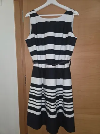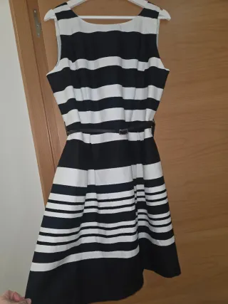 Vestido de fiesta con un diseño de rayas clásico y elegante. - Diseño sin mangas. - Cinturón fino a juego. - Falda con vuelo.