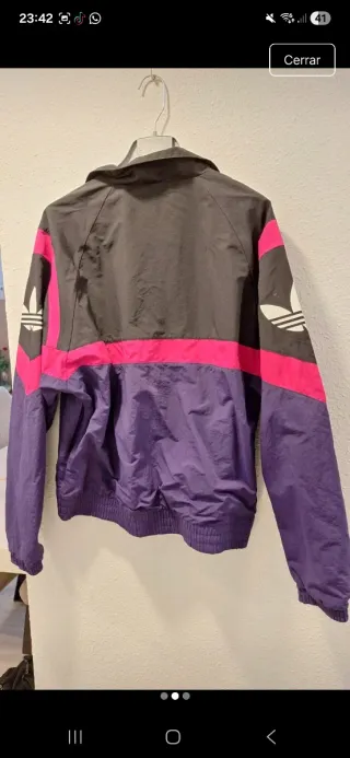 Chaqueta deportiva Adidas con un diseño llamativo. Pone talla 2xs pero yo llevo la M de normal y me va anchita - Combinación de colores negro, rosa intenso y morado. - Logo de Adidas en el pecho. - Cierre de cremallera frontal. - Puños y cintura elásticos. -Usada 2/3 veces