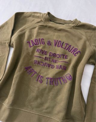Sudadera de Zadig & Voltaire con un diseño moderno y llamativo. Está en buen estado, al lado de la letra T presenta un descosido, ese es su defecto! La talla equivale a una XS6E - Color verde oliva. - Inscripción RIVE DROITE y ART IS TRUTH en morado. - Cuello redondo y mangas largas.