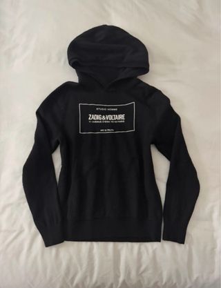 Sudadera con capucha de Zadig & Voltaire en color negro. Presenta un diseño moderno con el logo de la marca. Está en muy buen estado es muy calentito La talla equivale a una xxs😘 cualquier duda pregunta - Logo estampado en el frontal. - Capucha ajustable. - Manga larga.