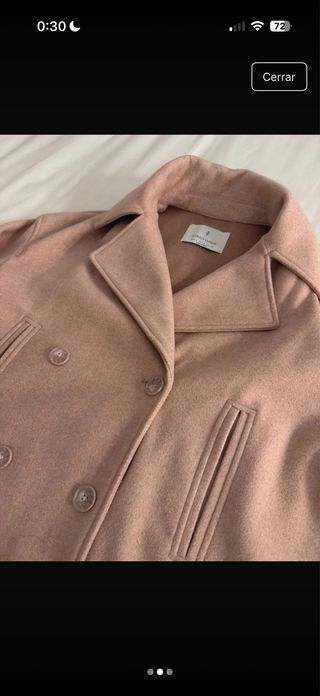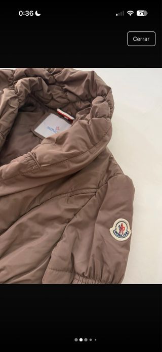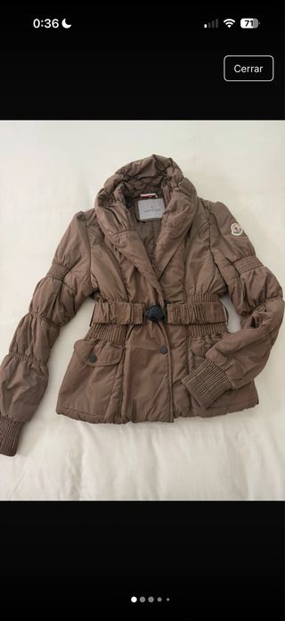 Elegante abrigo de la marca Moncler en color marrón. Presenta un diseño con cinturón ajustable y mangas abullonadas. Está en muy buen estado, tiene un pequeño cosido en una de las mangas que prácticamente no se nota al usarla. La talla equivale a una XS-S - Cuello alto con detalle fruncido. - Cinturón con hebilla. - Bolsillos frontales con botones. - Puños elásticos.
