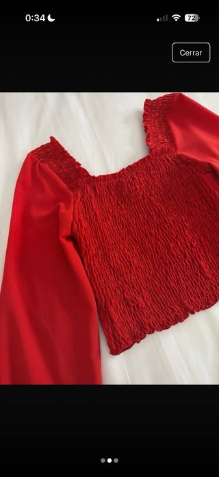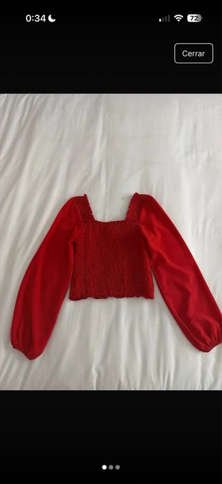 Camisa roja con mangas largas y escote cuadrado. - Tejido elástico y fruncido en el cuerpo. - Mangas abullonadas. - Diseño moderno y favorecedor.
