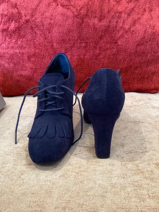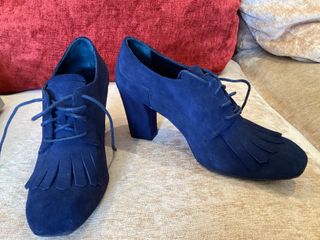 Elegantes zapatos de ante en color azul, sin estrenar. Vintage. - Diseño con cordones y detalle de flecos. - Tacón grueso y cómodo.