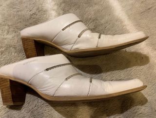 Zuecos blancos con un diseño moderno y elegante. - Tacón de madera. - Puntera afilada. - Tiras decorativas en la parte superior. - Algún signo de desgaste