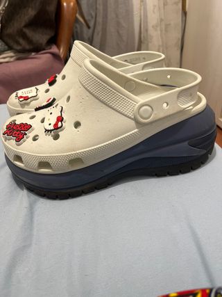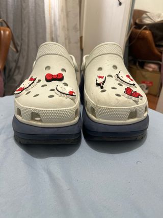 Zuecos Crocs con plataforma y adornos de Hello Kitty. - Diseño blanco con detalles en azul marino. - Adornos de Hello Kitty y Hello Kitty en la parte delantera. están en buen estado (solo están sucias )