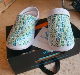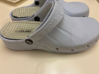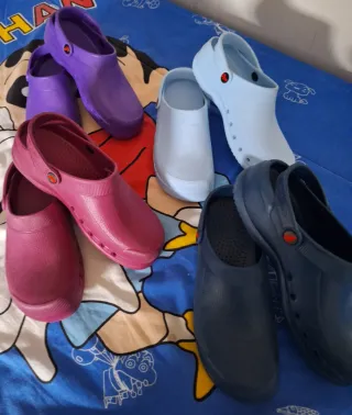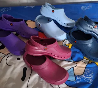 Zuecos cómodos y prácticos. - Colores azul ,celeste, morado, burdeos y verde. - Talla 39. Precio unidad 7 euros.