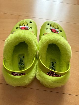Zuecos Crocs con temática navideña del Grinch. Perfectos para un toque divertido y festivo. - Diseño con el personaje del Grinch. - Adornos de bastones de caramelo y regalos. - Forro interior de pelo sintético para mayor comodidad. - Color verde brillante.talla 34/35