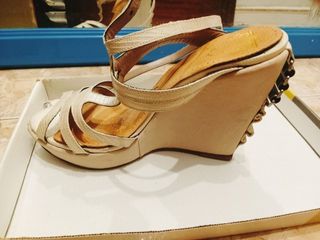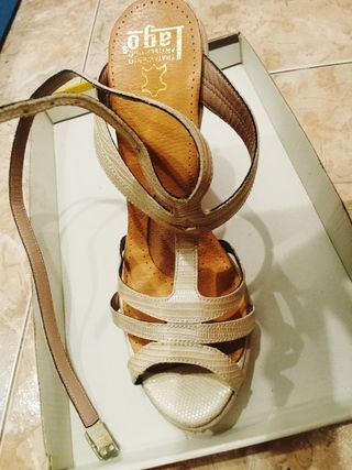 Elegantes zuecos de cuero de la marca Lago. - Material: Cuero - Color: Beige y dorado