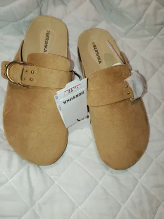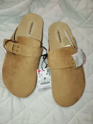 Zuecos de la marca Bershka,con un diseño moderno y cómodo.serraje en color beige. - Detalle de hebilla dorada. - Diseño abierto en el talón. - Material exterior de ante. - Suela con extra confort.
