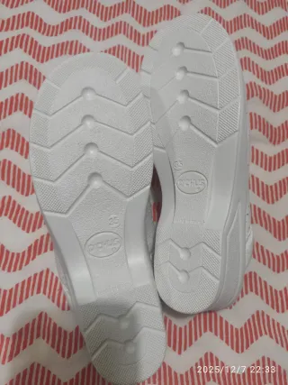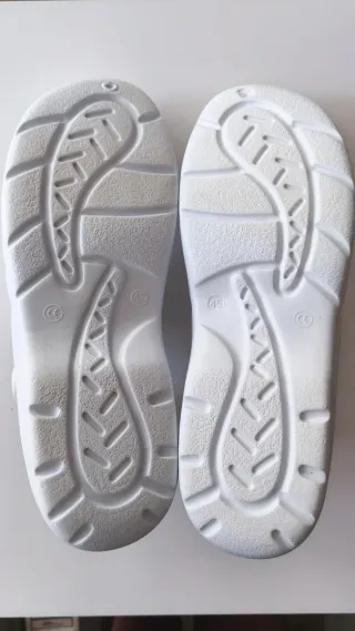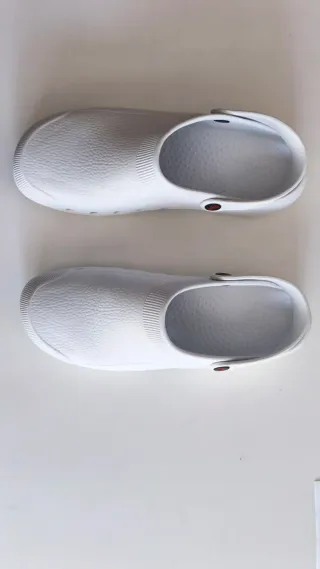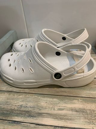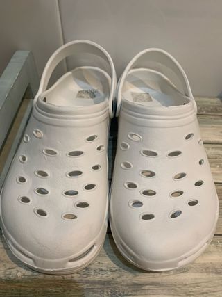 Zuecos blancos de estilo Crocs, talla 45. Refuerzos en puntera.Perfectos enfermería, cocinas... Son cómodos y prácticos. Utilizados una sola vez, en perfecto estado - Material sintético. - Diseño cerrado. - Suela con relieve.