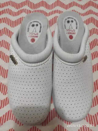 Zuecos blancos de la marca D'CHUS J.SORIANO, talla 35. Son cómodos y anatómicos, perfectos para el día a día. - Diseño perforado para mayor transpiración. - Detalle de logo en la plantilla.