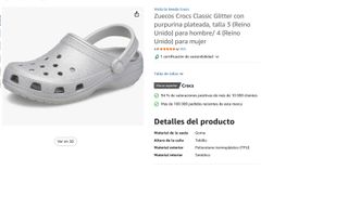Zuecos Crocs Classic Glitter en color plata. Talla 4 M -6W ,ESPAÑA 36-37 - Material exterior: Poliuretano termoplástico (TPU). - Material interior: Sintético. - Material de la suela: Goma. - Altura de la caña: Tobillo.