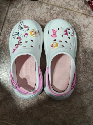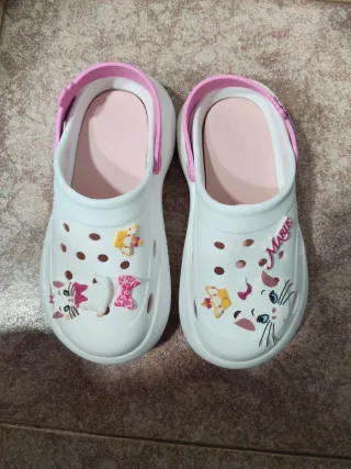 Zuecos estilo Crocs comprados en un viaje a China. Son cómodos y tienen un diseño divertido. - Decorados con personajes de gatitos. - Tira trasera ajustable. - Suela interior con textura.