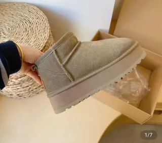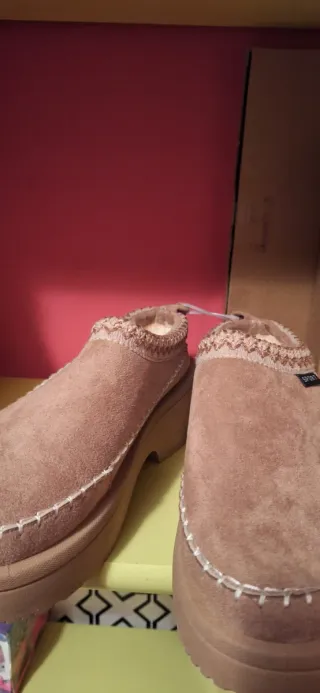 Botas o zuecos de estilo ug moderno muy calentita. Detalle de pespunte blanco en el borde. Suela gruesa. Pídeme las medidas y se las paso. Sin estrenar solo puestas 1 vez pero me estan grandes por eso las vendo.