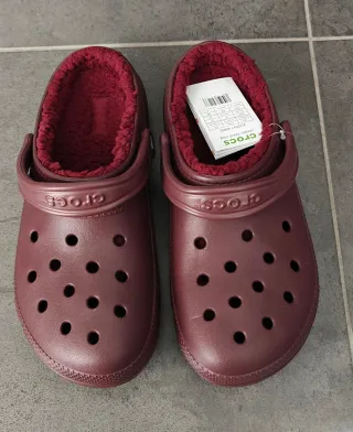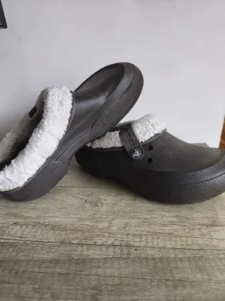 Zuecos de invierno Crocs en color marrón. Perfectos para estar cómodo en casa o para el frío. - Forro interior suave. - Diseño clásico con orificios. - Tira trasera para mayor sujeción.