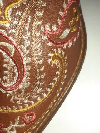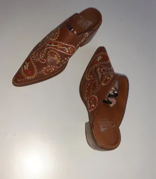 Zuecos estilo tejano con un bonito bordado. Son de piel y tienen muy muy poco uso - Diseño de botín. - Punta fina. - Bordado floral en tonos rojos y amarillos. - Tacón bajo.