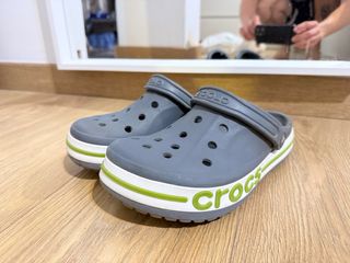 Calzado tipo zueco de la marca Crocs. - Diseño en color gris. - Detalles en color verde lima en la suela.