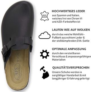 Zuecos de piel color negro, talla 42, de la marca AFS. Hechos en Alemania. -Piel de alta calidad de España e Italia. -Suela de EVA. -Cierre ajustable. -Cómodos y ligeros. Estado Sin estrenar Talla 42 Marca AFS Color Negro B07MW7RY2W