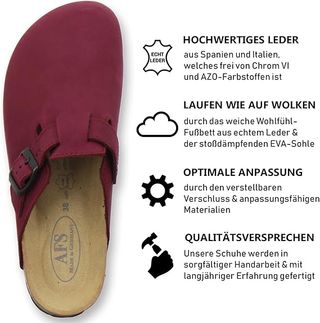 Zuecos de piel color rojo, talla 42, de la marca AFS. Hechos en Alemania. -Piel de alta calidad de España e Italia. -Suela de EVA. -Cierre ajustable. -Cómodos y ligeros. Estado: Sin estrenar B01CAX6WTM