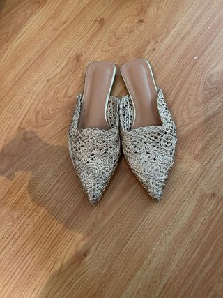Elegantes zuecos dorados con un diseño calado. - Diseño de punta afilada. - Acabado metálico brillante. - Detalle de espirales en el tejido.